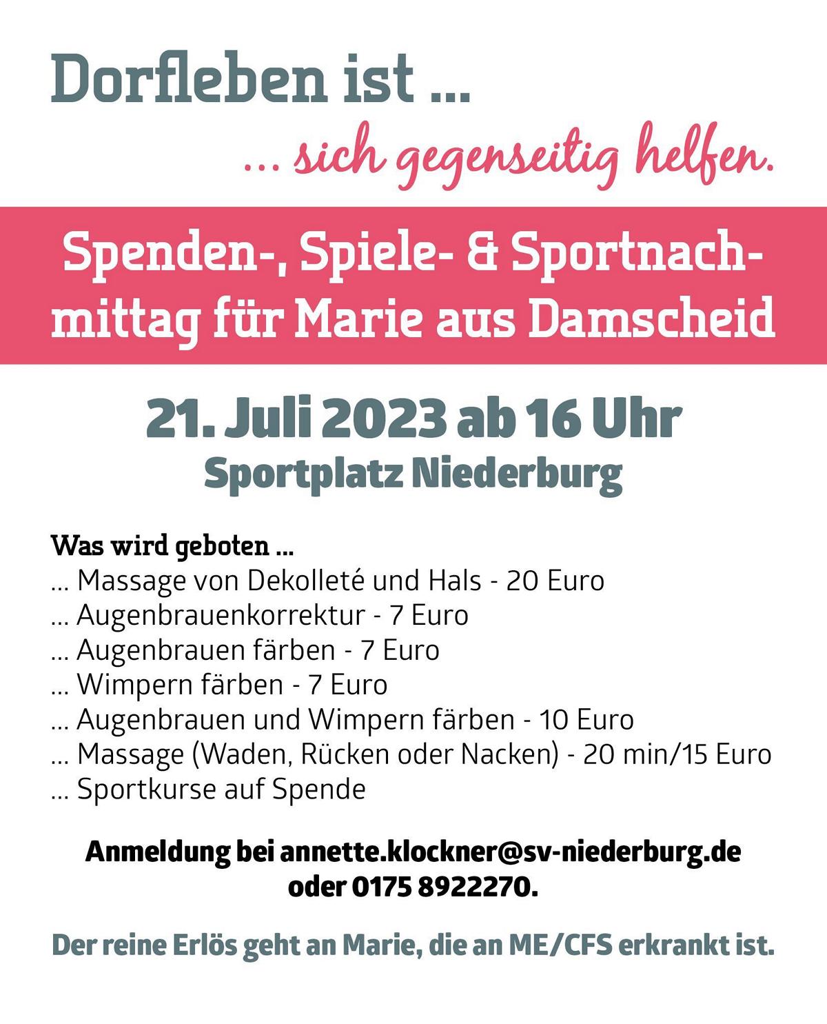 die Spendenaktion wird am Freitag, 21.07.2023, ab 16:00 Uhr am Sportplatz in Niederburg gestartet.