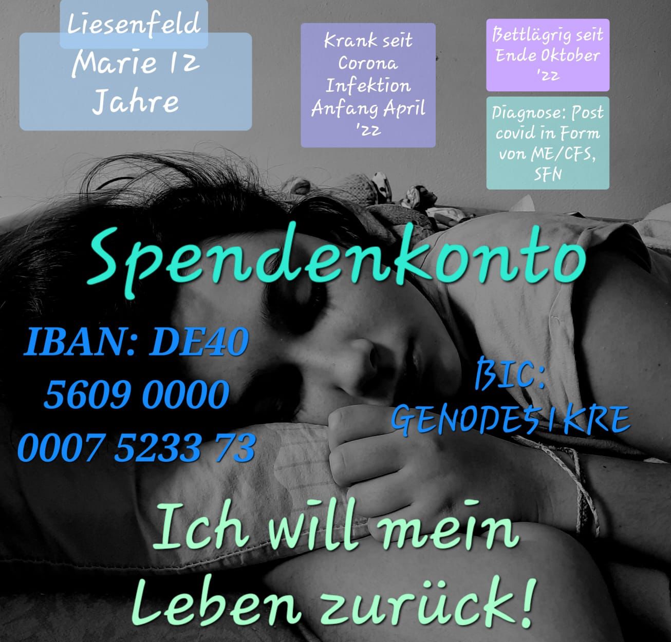 Marie leidet nach einer Covid19-Erkrankung an ME/CFS, einer schweren neuroimmunologischen Erkrankung. Die Symptome sind unter anderem starke Erschöpfung, Schmerzen sowie Schlaf- und Konzentrationsstörungen. Die Therapiekosten, um Marie zu helfen: bis zu 25.000 €. Hierfür soll gesammelt werden.