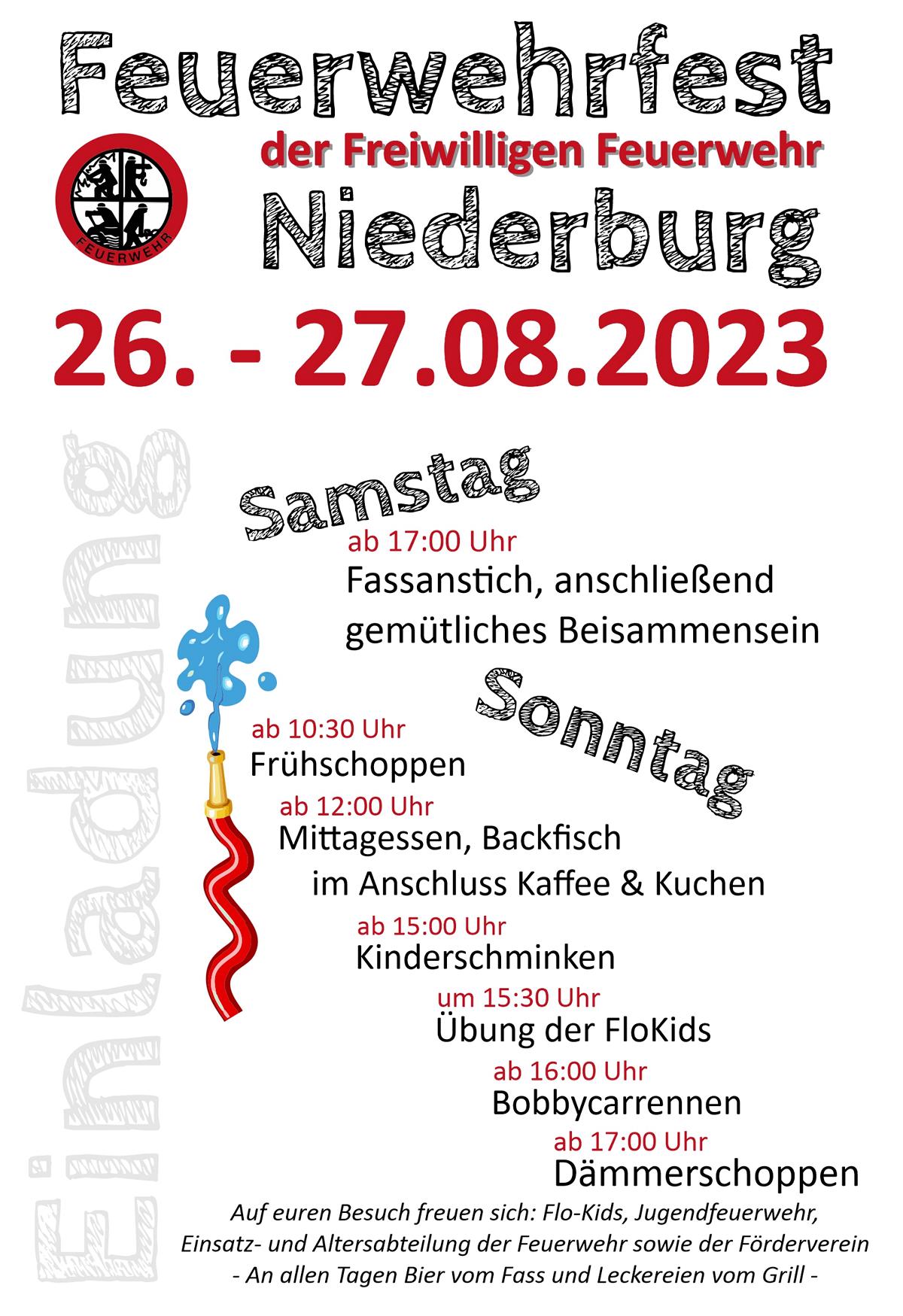am 26.-27.08.2023 veranstalten wir unser diesjähriges Feuerwehrfest rund um unser Gerätehaus in Niederburg. Hierzu möchten wir alle recht herzlich einladen. Auch dieses Jahr wartet wieder ein abwechslungsreiches Programm auf Euch.