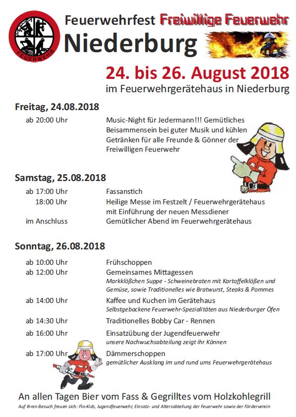 Die Feuerwehr Niederburg lädt Sie recht herzlich zum Feuerwehrfest vom 24.08.-26.08.2018 ein!