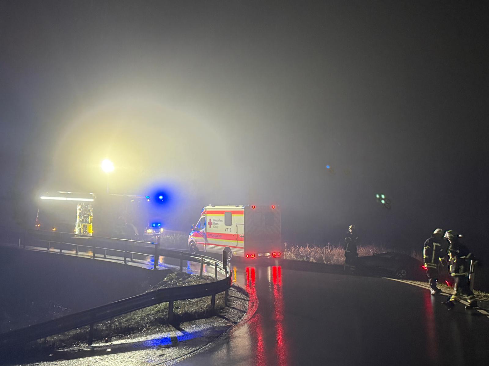 Alarmierung über e-Call - Ein PKW war von der Fahrbahn abgekommen und in einen Straßengraben gefahren. Die betroffene Person konnte sich bereits selbstständig aus dem Fahrzeug befreien. Unsere Aufgabe beschränkte sich auf die Absicherung der Einsatzstelle, Versorgung des Patienten sowie das Ausleuchten der Unfallstelle für den Abschleppdienst.